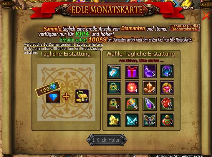 gleich mal von meinerseits eine Frage zur edlen Monatskarte. Euch ist sicher schon aufgefallen, dass im Fenster, wo ihr euch t?glich eure Belohnungen abholen k?nnt, ein kleiner Zusatztext steht, bez?glicher erneuter Z?ge, um mehr Items bekommen zu k?nnen.