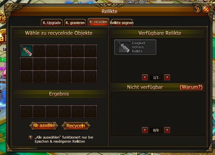 wir vermuten, dass der Fehler daher r?hrt, dass Relikte mit Level 110 aktuell das maximale Ausr?stungslevel haben und erst, wenn die h?heren Relikte eingepatcht werden, man die anderen wieder wie gewohnt recyceln kann.