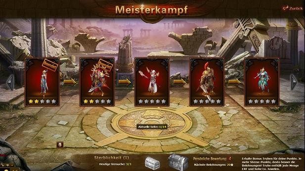 - Meisterkampf wird ab Lv. 40 freigeschaltet. Es hat 14 Kapitel. Jedes Kapitel umfasst 5 Level, und jedes Level hat einen Boss Kampf.Spieler haben 3 Versuche pro Tag.
