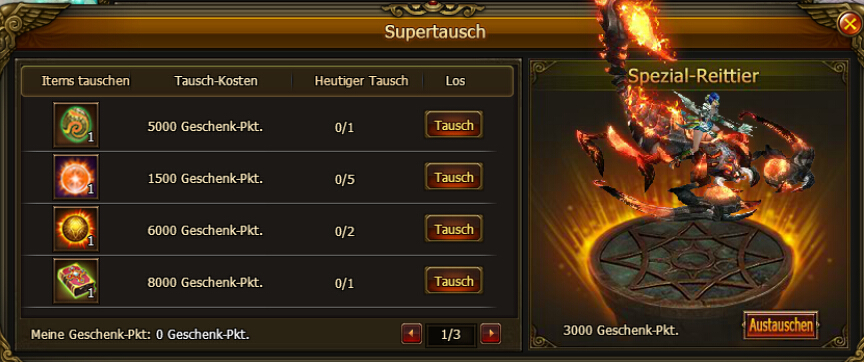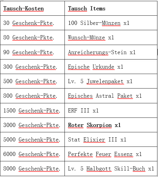 Beschreibung: Beende bestimmte Quests w?hrend dem Event um Geschenk-Pkt. zu erhalten. Verschiedene Events bringen verschiedene Punkte. Benutze Geschenk-Pkt. im Supertausch um sie gegen seltene Items und Spezial-Reittiere zu tauschen.