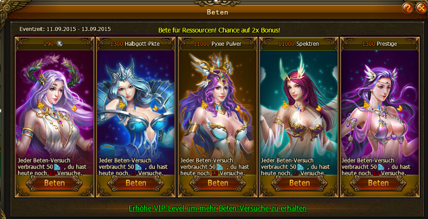 - Nicht-VIP Spieler k?nnen 10 Mal am Tag f?r die Ressource ihrer Wahl beten. Du erh?ltst extra Gebete f?r jeden Ressourcentyp durch ein Upgrade deines VIP Levels (VIP1-VIP2 haben 11 Versuche, VIP3-VIP4 12 Versuche, etc.)
