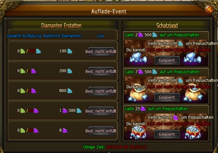 Beschreibung: Spieler Lv. 15+, die gen?gend Diamanten aufladen, k?nnen Diamanten erstattet bekommen. Zus?tzlich k?nnen sie nach Diamanten graben in Schatzjagd!