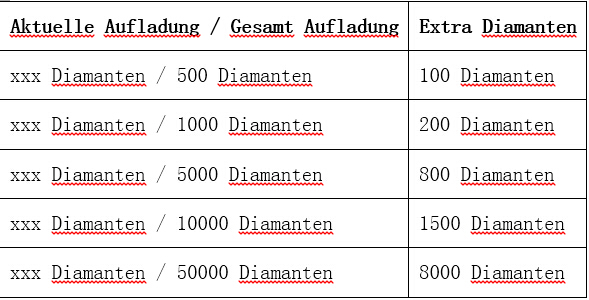 - Auflademenge werden angesammelt, d.h. wenn du 1000 Diamanten aufl?dst, kannst du beide 100 Diamanten und 200 Diamanten Belohnungen sammeln.