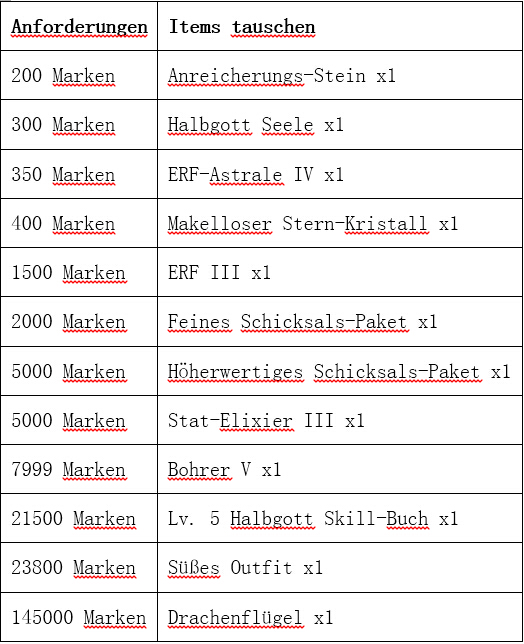 Beschreibung: W?hrend des Events k?nnen Spieler durch Ausgeben und Aufladen Marken verdienen, die gegen spezielle Items getauscht werden k?nnen. Spieler erhalten eine Marke pro aufgeladenen Diamanten, und eine weitere f?r jeden im Tresor oder Shop ausgegebenen Diamanten. Mit genug Marken erh?ltst du au?erdem auf der linken Seite gratis Items. Einsammeln der Items links verbraucht keine Marken.