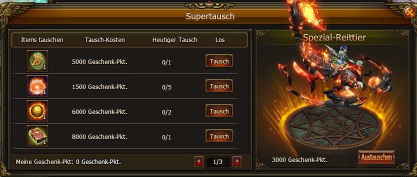 Beschreibung: Beende bestimmte Quests w?hrend dem Event um Geschenk-Pkt. zu erhalten. Verschiedene Events bringen verschiedene Punkte. Benutze Geschenk-Pkt. im Supertausch um sie gegen seltene Items und Spezial-Reittiere zu tauschen.