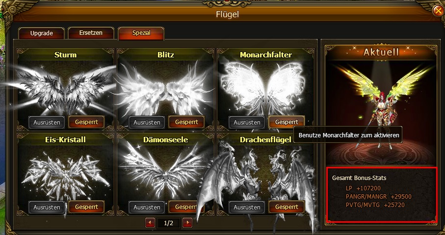 - Der "Upgrade" Knopf wird eine besonderen Effekt haben, wenn du Spezial Fl?gel aufwertest.