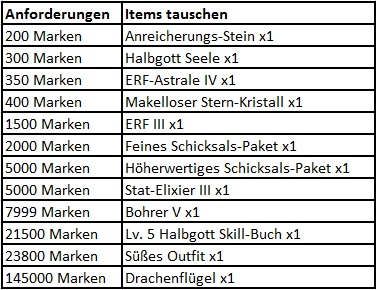 Beschreibung: W?hrend des Events k?nnen Spieler durch Ausgeben und Aufladen Marken verdienen, die gegen spezielle Items getauscht werden k?nnen. Spieler erhalten eine Marke pro aufgeladenen Diamanten, und eine weitere f?r jeden im Tresor oder Shop ausgegebenen Diamanten. Mit genug Marken erh?ltst du au?erdem auf der linken Seite gratis Items. Einsammeln der Items links verbraucht keine Marken.