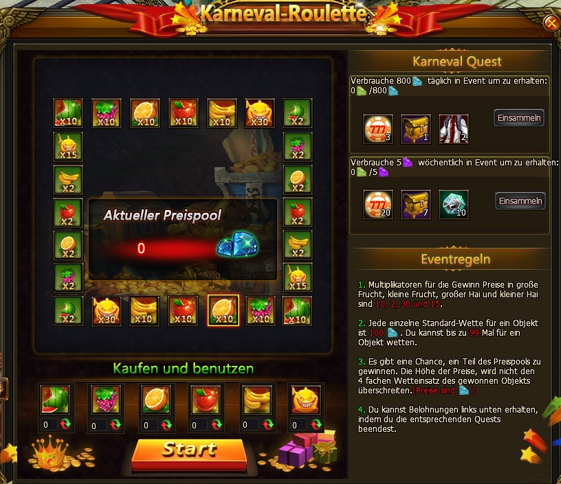? Oster Roulette: W?hrend dem Event, neben Oster Roulette um tolle Preise zu gewinnen, kannst du auch extra Belohnungen durch drehen des Roulette-Rad bekommen f?r bestimmte Anzahl an Drehs.