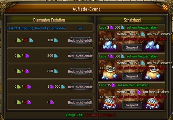Beschreibung: Spieler Lv. 15+, die gen?gend Diamanten aufladen, k?nnen Diamanten erstattet bekommen. Zus?tzlich k?nnen sie nach Diamanten graben in Schatzjagd!