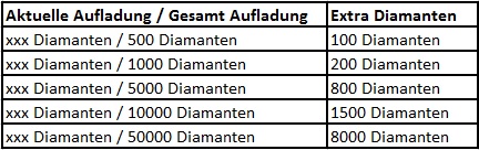 - Auflademenge werden angesammelt, d.h. wenn du 1000 Diamanten aufl?dst, kannst du beide 100 Diamanten und 200 Diamanten Belohnungen sammeln.