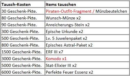 Beschreibung: Beende bestimmte Quests w?hrend dem Event um Geschenk-Pkt. zu erhalten. Verschiedene Events bringen verschiedene Punkte. Benutze Geschenk-Pkt. im Supertausch um sie gegen seltene Items und Spezial-Reittiere zu tauschen.