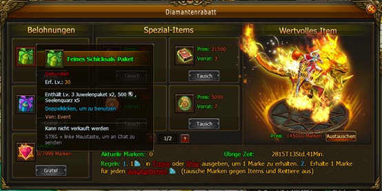 Beschreibung: W?hrend des Events k?nnen Spieler durch Ausgeben und Aufladen Marken verdienen, die gegen spezielle Items getauscht werden k?nnen. Spieler erhalten eine Marke pro aufgeladenen Diamanten, und eine weitere f?r jeden im Tresor oder Shop ausgegebenen Diamanten. Mit genug Marken erh?ltst du au?erdem auf der linken Seite gratis Items. Einsammeln der Items links verbraucht keine Marken.