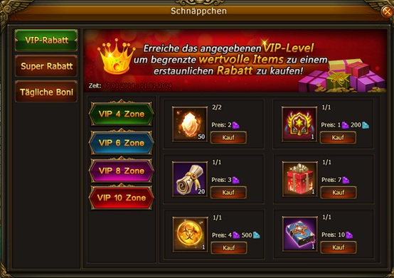 1. VIP-Rabatt: Enth?lt vier VIP Zonen: VIP4 Zone, VIP6 Zone, VIP8 Zone und VIP10 Zone. Erreiche das angegebenen VIP-Level um begrenzte wertvolle Items mit erstaunlichen Rabatt zu kaufen. Je h?her das VIP-Level, desto niedriger der Preis.