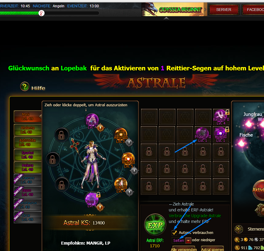 Bei aktivierter Automatik und "selten oder niedriger" werden die seltenen Astrale nicht verwendet: