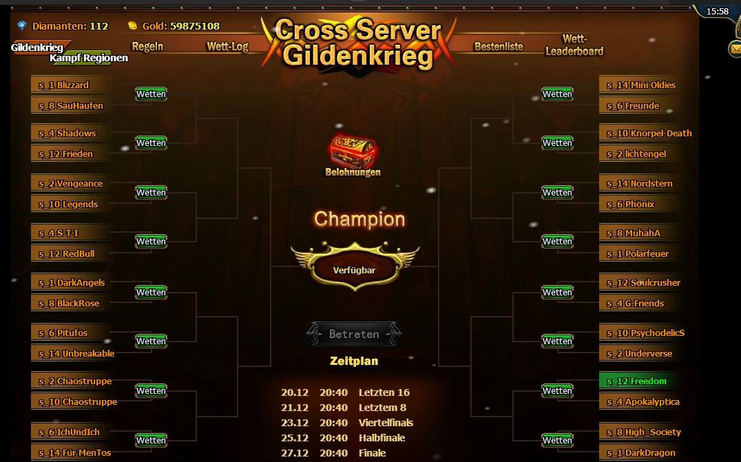 Bin der Everell von der Gilde Freedom, Server 12. Habe mir die sogenannte CS-Auslosung f?r Sonntag beginnend mal genauer angesehen, und erhebe hiermit die Anschuldigung gegen Shadowbounds, das diese sogenannte Auslosung Betrug ist.
