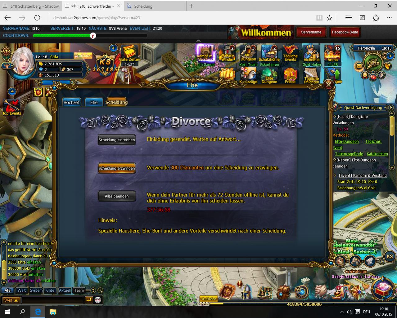 Gibt es eine M?glichkeit, sich scheiden zu lassen, wenn man die Scheidung eingereicht hat und der Partner nur das X gedr?ckt hat und danach ?ber 300stunden nicht mehr online gekommen ist. Dann wird ja alles bis auf mit Dias grau angezeigt, gibt es eine M?glichkeit dieses zu umgehen?