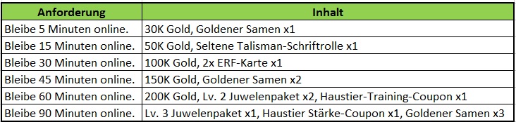 Beschreibung: Beende w?hrend des Events folgendes, um eine Belohnung zu erhalten! Wird t?glich zur?ckgesetzt. Verf?gbar nur f?r Server ?lter als 30 Tage.