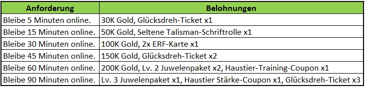 Beschreibung: Beende w?hrend des Events folgendes, um eine Belohnung zu erhalten! T?glich zur?ckgesetzt. Verf?gbar nur f?r Server ?lter als 30 Tage.