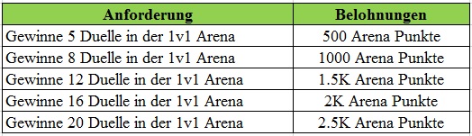 Beschreibung: Beende w?hrend des Events folgende Herausforderungen in 1v1 Arena, um eine Belohnung zu erhalten! Wird t?glich zur?ckgesetzt. Verf?gbar nur f?r Server, die l?nger als 30 Tage offen sind.
