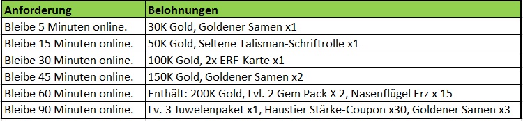 Beschreibung: Beende w?hrend des Events folgendes, um Belohnungen zu erhalten! T?glich zur?ckgesetzt. Verf?gbar nur f?r Server ?lter als 30 Tage.
