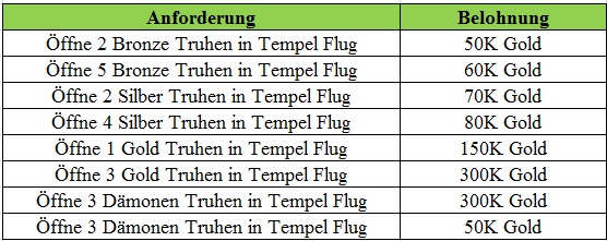 Beschreibung: Beende w?hrend des Events folgendes, um eine Belohnung zu erhalten! Wird t?glich zur?ckgesetzt. Verf?gbar nur f?r Server ?lter als 30 Tage.
