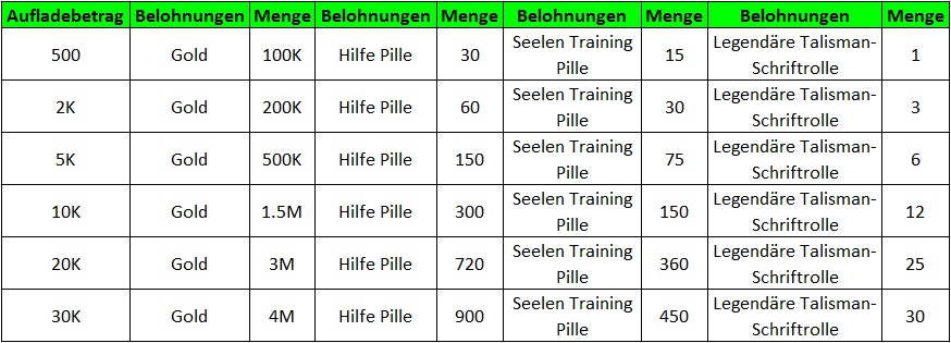 Beschreibung: Lade die ben?tigte Menge auf, um fantastische Pr?mien zu erhalten. Jede Belohnung kann nur einmal abgeholt werden. Wird t?glich zur?ckgesetzt.