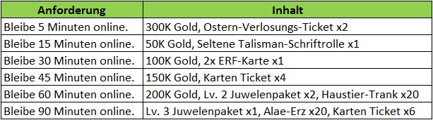 Beschreibung: Beende w?hrend des Events folgendes, um Belohnungen zu erhalten! Wird t?glich zur?ckgesetzt. Verf?gbar nur f?r Server ?lter als 30 Tage.