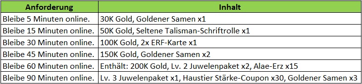 Beschreibung: Beende w?hrend des Events folgendes, um eine Belohnung zu erhalten! Verf?gbar nur f?r Server ?lter als 30 Tage.