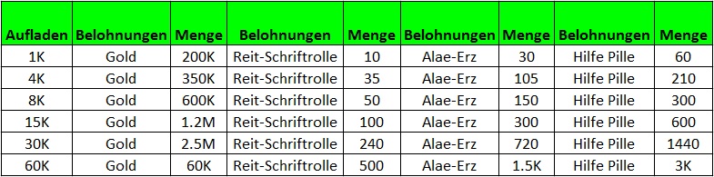 Beschreibung: Lade die ben?tigte Menge auf, um fantastische Belohnungen zu erhalten. Jede Belohnung kann nur einmal geholt werden.
