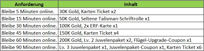Beschreibung: Beende w?hrend des Events folgendes, um Belohnungen zu erhalten! Wird t?glich zur?ckgesetzt. Verf?gbar nur f?r Server ?lter als 30 Tage.