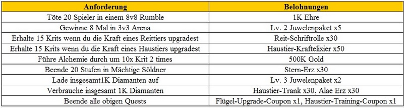 Beschreibung: Beende w?hrend des Events folgendes, um eine Belohnung zu erhalten! Verf?gbar nur f?r Server ?lter als 30 Tage.