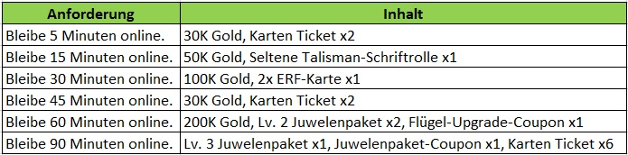 Beschreibung: Beende w?hrend des Events folgendes, um Belohnungen zu erhalten! Wird t?glich zur?ckgesetzt. Verf?gbar nur f?r Server ?lter als 30 Tage.
