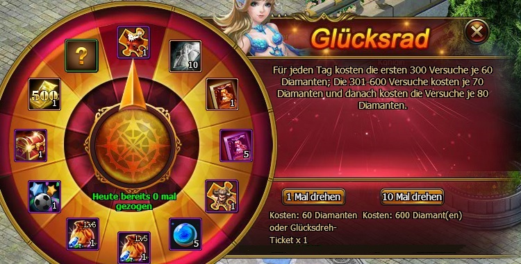 Beschreibung: Drehe das Rad in Gl?cksrad, um zuf?llige Belohnungen zu erhalten. Du hast eine Chance, Gargoyle St?rke Splitter und Teuflischer Herzog Splitter zu erhalten.