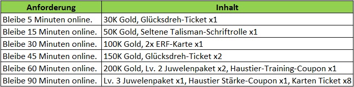 Beschreibung: Beende w?hrend des Events folgendes, um Belohnungen zu erhalten! Wird t?glich zur?ckgesetzt. Verf?gbar nur f?r Server ?lter als 30 Tage.