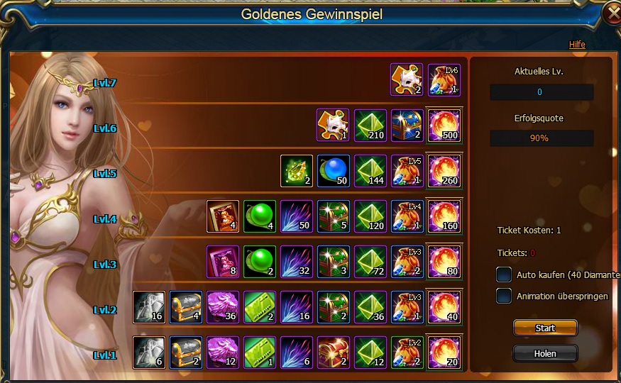 Beschreibung: Ziehen f?r eine Chance auf eine Belohnung aus dem n?chsten Level. Wenn du ziehst und eine Belohnung erh?ltst, kannst du diese holen oder verzichten und weiterziehen. Wenn du eine Belohnung vom letzten jedes Levels erh?ltst, wird die Belohnung automatisch gesammelt und das Event wird auf Lv. 0 zur?ckgesetzt.