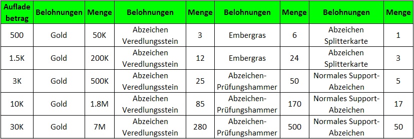 Beschreibung: Lade eine bestimmte Menge auf und erhalte fantastische Belohnungen. Nur die h?chste Belohnung, f?r die du dich qualifiziert hast, kann gesammelt werden.