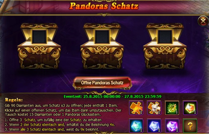 Beschreibung: Klicke auf "Pandoras B?chse"-Icon. Das erste Ziehen kostet 90 Diamanten und der Tausch der Truhen kostet 15 Diamanten.