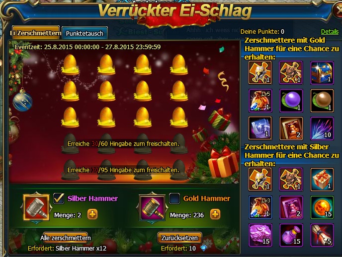 Beschreibung: Benutze w?hrend dem Event Gold oder Silber Hammer um Eier zu zerschmettern und werde belohnt. Zerbrochene Eier zur?cksetzen verbraucht Diamanten, je mehr desto h?her die Kosten. Erreiche die t?gliche Hingabe um mehr Versuche zu erhalten. Du erh?ltst Punkte, die du gegen Items tauschen kannst. Erreiche die Server Punkteanforderungen um noch mehr Tausch-M?glichkeiten zu erhalten!