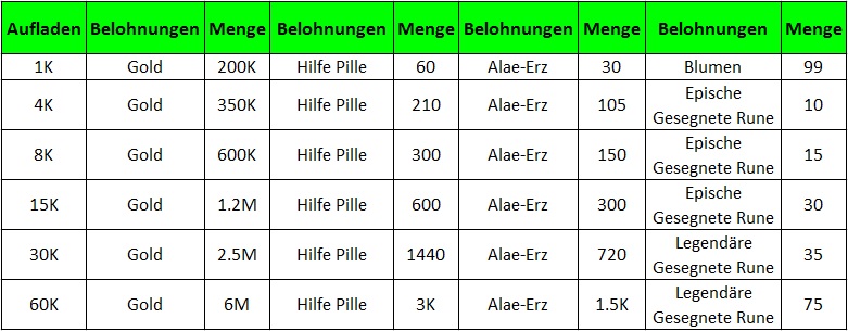 Beschreibung: Lade die ben?tigte Menge auf, um fantastische Belohnungen zu erhalten. Jede Belohnung kann nur einmal geholt werden.