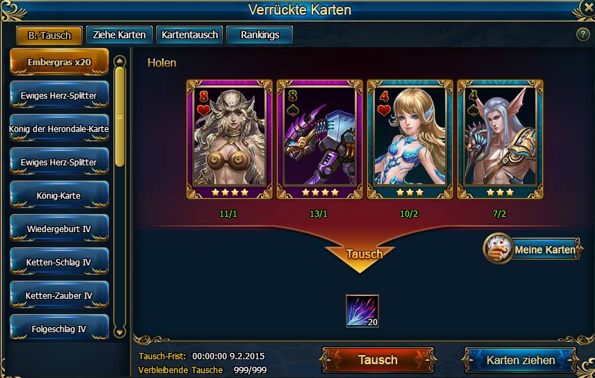 b?Tausche Karten gegen Belohnungen oder spalte sie auf zu Kartenpunkten. Kartenpunkten k?nnen gegen Karten getauscht werden.