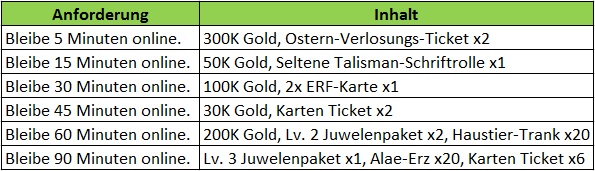 Beschreibung: Beende w?hrend des Events folgendes, um Belohnungen zu erhalten! Wird t?glich zur?ckgesetzt. Verf?gbar nur f?r Server ?lter als 30 Tage.