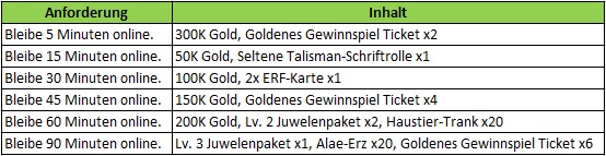 Beschreibung: Beende w?hrend des Events folgendes, um eine Belohnung zu erhalten! Wird t?glich zur?ckgesetzt. Verf?gbar nur f?r Server ?lter als 30 Tage.