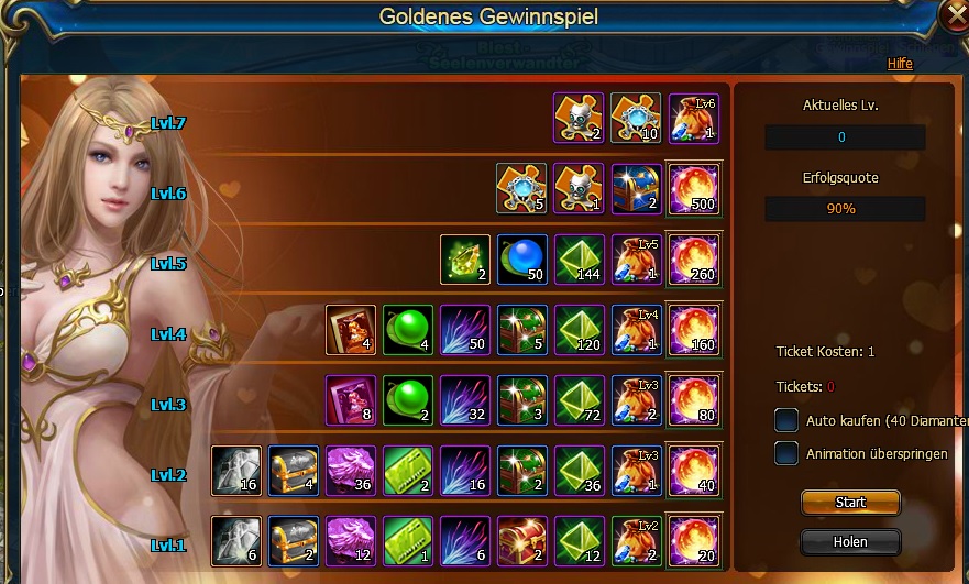 Beschreibung: Ziehen f?r eine Chance auf eine Belohnung aus dem n?chsten Level. Wenn du ziehst und eine Belohnung erh?ltst, kannst du diese holen oder verzichten und weiterziehen. Wenn du eine Belohnung vom letzten jedes Levels erh?ltst, wird die Belohnung automatisch gesammelt und das Event wird auf Lv. 0 zur?ckgesetzt.