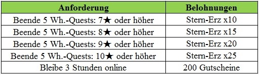Beschreibung: Beende w?hrend des Events folgendes, um Belohnungen zu erhalten! Wird t?glich zur?ckgesetzt. Verf?gbar nur f?r Server ?lter als 30 Tage.