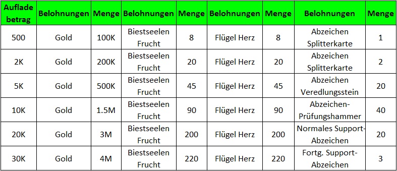 Beschreibung: Lade die ben?tigte Menge auf, um fantastische Pr?mien zu erhalten. Jede Belohnung kann nur einmal abgeholt werden. Wird t?glich zur?ckgesetzt.