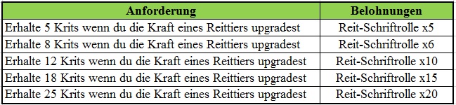 Beschreibung: Verbrauche die ben?tigten Mengen an Materialien f?r Reittiere um Belohnungen zu erhalten. Versuche und Belohnungen werden t?glich zur?ckgesetzt.