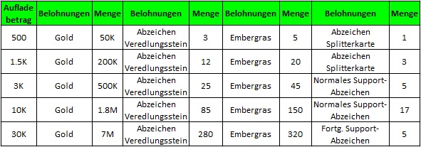 Beschreibung: Lade eine bestimmte Menge auf und erhalte fantastische Belohnungen. Nur die h?chste Belohnung, f?r die du dich qualifiziert hast, kann gesammelt werden.