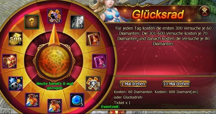 Beschreibung: Ziehen f?r eine Chance auf eine Belohnung aus dem n?chsten Level. Wenn du ziehst und eine Belohnung erh?ltst, kannst du diese holen oder verzichten und weiterziehen. Wenn du eine Belohnung vom letzten jedes Levels erh?ltst, wird die Belohnung automatisch gesammelt und das Event wird auf Lv. 0 zur?ckgesetzt.