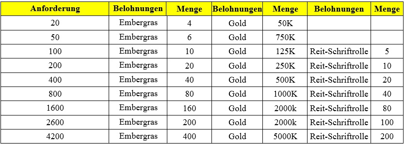 Beschreibung: Verbrauche die erforderliche Menge an Materialien t?glich f?r das Reittier um Belohnungen zu erhalten.