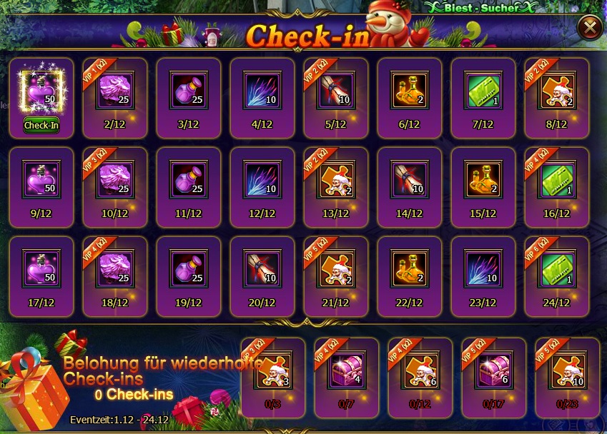Beschreibung: W?hrend dem Event kannst du einchecken und jeden Tag Belohnungen erhalten. Erreiche eine bestimmte Anzahl an Check-ins und erhalte zus?tzliche Belohnungen. Du kannst Weihnachtsmann-Splitter sammeln und synthetisieren. 10 von denen ergeben einen neuen S?ldner - der Weihnachtsmann! Er kann bis zu 4-Sterne aufgewertet werden.